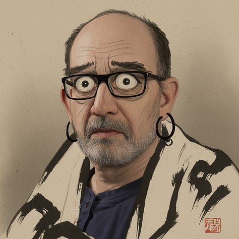 Man oh man, AI is stupid. It can’t think beyond the text prompt. So I end up with a “face swap” of a photo into Japanese art, a strange image that looks like me imitating Kash Patel wearing a tallis, the Jewish prayer shawl worn by men who have had a Bar Mitzvah, and the one in the middle. That’s the one I chose.