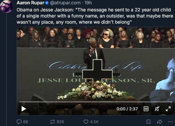 A quick one. I commented on a Bluesky post by Aaron Rupar featuring a video clip of President Barack H. Obama praising the recently deceased Rev. Jesse Jackson. When Rev. Jackson campaigned for president in 1984 as a Democrat he called New York City “Hymietown.” His excuse at the time was he thought his comment, to a black reporter from The Washington Post, was “off the record.” A familiar excuse from a politician.